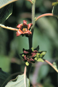 In 1980, the Ohio Forestry Association recorded a 66-foot specimen of Persimmon in Van Wert County, Ohio. The Persimmon typically has a rather short trunk and a rounded or cylindrical crown of dense branches. Often, it sprouts from its roots and thickets of smaller trees surround a larger one. Sometimes the Persimmon grows as a shrub. The thick, brown to black bark is distinctively broken into small, square blocks. This tree probably is best known for its sweet, orange fruit in the fall. The Persimmon grows in light, well-drained soils. It can be found in a variety of places: in moist valleys and on drier uplands, along roadsides, in old fields and clearings, and in mixed forests. This tree ranges from southern New England throughout the southeastern United States, westward to Iowa, Oklahoma and Texas. Ohio is at the northern limit of its range, and the Persimmon occurs in the southern and southeastern counties. The wood of this tree is close-grained, strong and hard. Woodworkers use it to make golf club heads, billiard cues, and shuttles that are used in weaving. Also, workers use it for veneer and flooring. People eat the fresh fruit, and they make Persimmon bread, puddings and cakes. Native American Indians stored dried Persimmon fruit like prunes. Many animals, including turkey, quail, opossums, raccoons, skunks and deer, feed on the fruit.