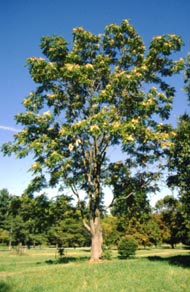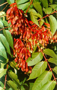 The rank, offensive odor of crushed leaves from this tree leads one to wonder how it ever got its common name. The distinctive leaflets of the compound leaves have just a few teeth near the base of each leaflet. Each "tooth" has a small gland at the end of its vein. Native to eastern Asia, this introduced tree has been planted extensively as an ornamental. It often is successful in crowded cities where many other trees will not grow. In contrast, in a forest it sometimes is considered to be a "weed" tree when it crowds other species. The wood has no commercial value.